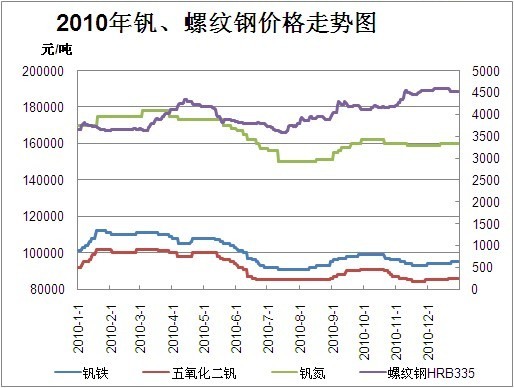 2010年1-12月钒、螺纹钢价格走势图