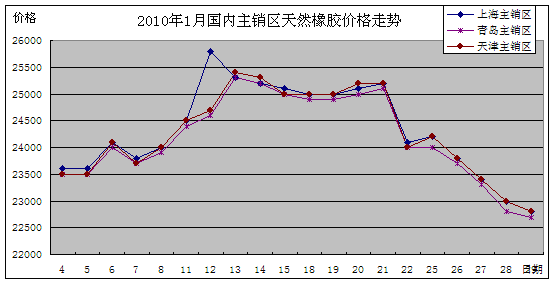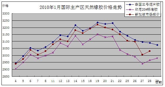 2010年1月天然橡胶市场动态 根据农业部农垦局(农业部发展南亚热带作物办公室)监测,2010年1月份泰国3号烟片胶(RSS3)和印尼20号标准胶(SIR20)价格全月呈先涨后跌,大起大落的态势。国内产销两地国产5号标准胶(SCR5)现货价格也跟随国外天然橡胶价格走势,上旬大幅上涨,中旬相对稳定,下旬大幅回落,产销两地成交清淡,成交量与上月相比有所减少。 国外主产区:1月份,泰国RSS3平均价格为3121美元/吨,比上月平均价上涨286美元/吨,最高价为3235美元/吨,最低价为2945美元/吨;印尼SIR20平均价格为3035美元/吨,比上月平均价上涨233美元/吨,最高价为3150美元/吨,最低价为2905美元/吨;新加坡期货市场的到期RSS3现货月平均价格为3090美元/吨,比上月平均价上涨285美元/吨,最高价为3220美元/吨,最低价为2940美元/吨。 国内主产区:1月份,国产五号标胶海口平均价格为23694元/吨,比上月平均价每吨上涨4676元,全月合计成交745吨;云南1月份平均价格为23954元/吨,比上月平均价每吨上涨1402元,全月合计成交4916吨。 国内主销区:1月份,上海市场国产5号标准胶平均价格为24330元/吨,比上月上涨2139元/吨,最高价为25200元/吨,最低价为22500元/吨;青岛市场平均价格为24175元/吨,比上月上涨2179元/吨,最高价为25100元/吨,最低价为22700元/吨;天津市场平均价格为24265元/吨,比上月上涨2217元/吨,最高价为25200元/吨,最低价为22800元/吨。 进口方面:根据海关统计,2009年12月份共进口181905吨,同比增加了67.6%,全年共进口1710678吨,同比增加了1.74%。 分析预测:1月下旬国内外天然橡胶价格大幅下跌,主要是受国际大宗商品价格大幅下跌的影响。预计2月份,国外主产区逐步进入落叶期,新增资源将有所减少。同时,随着国内汽车销售量及保有量的增加,橡胶需求量将有所增加。国内天然橡胶价格继续大幅下跌的可能性不大。