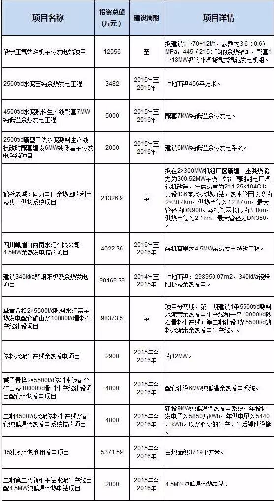 2015年全国拟在建水泥余热、余热发电项目信息汇总。共26个,其中包含:洛宁压气站燃机余热发电站项目,项目投资12056万元,拟建设1台70+12t/h,参数为3.6(0.6)MPa,445(215)℃的余热锅炉,配套1台18MW级的补汽凝汽式汽轮发电机组。